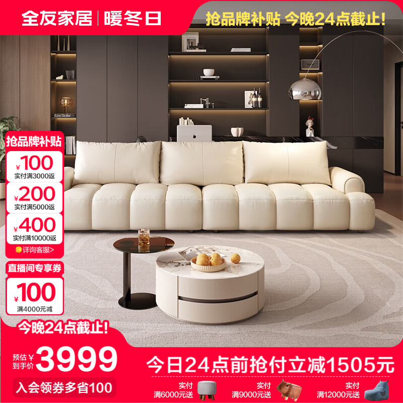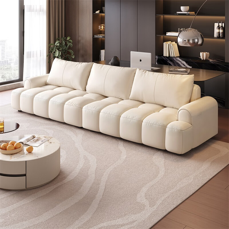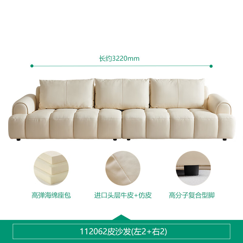 全友家居 头层牛皮艺沙发客厅奶油风棉花糖直排大户型真皮沙发112062