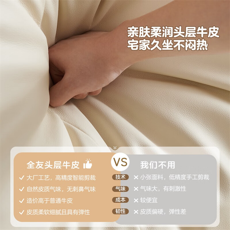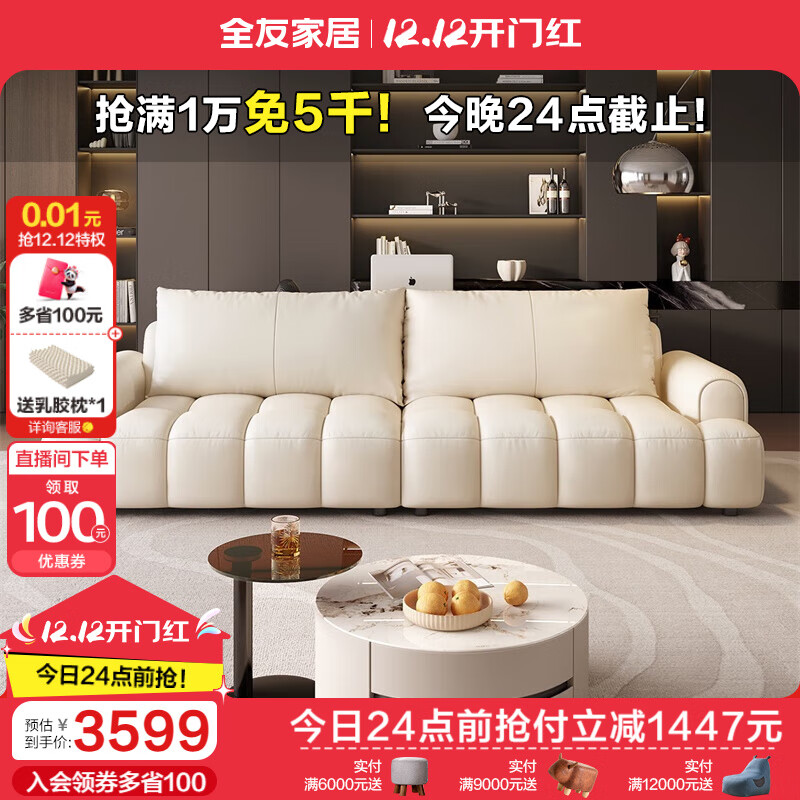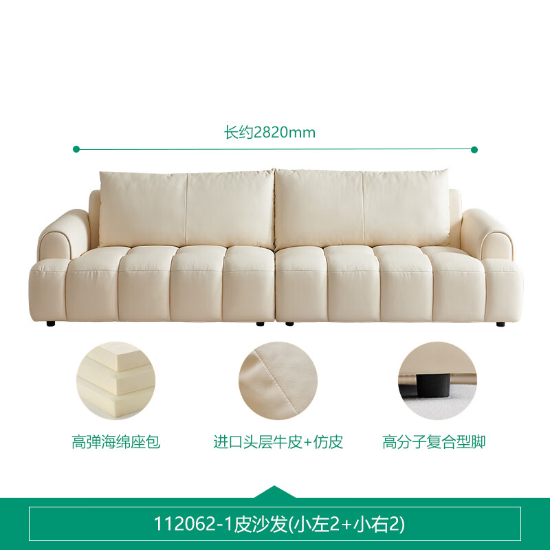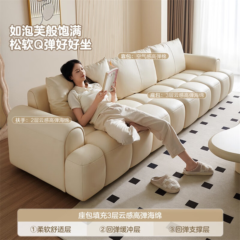 全友家居 头层牛皮艺沙发客厅奶油风棉花糖直排大户型真皮沙发112062