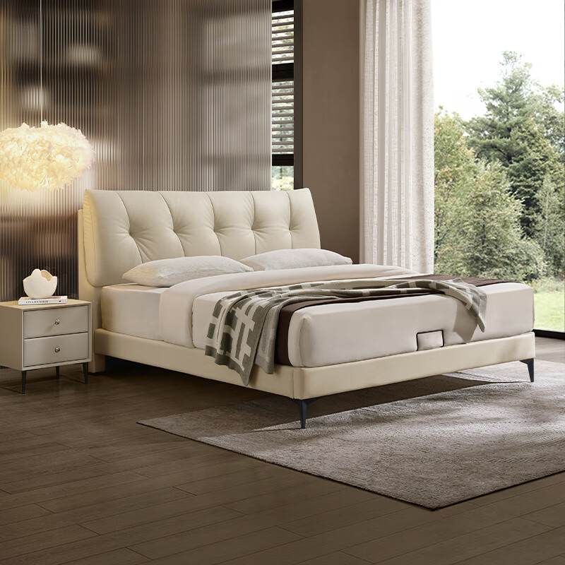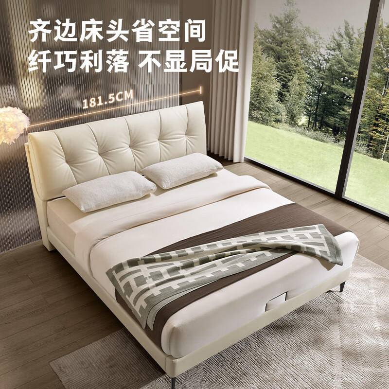 顾家家居现代轻奢奶油风卧室双人大床进口头层牛皮婚床高脚床8173布床9107 皮款【月暮白】+独袋弹簧乳胶垫 1800*2000