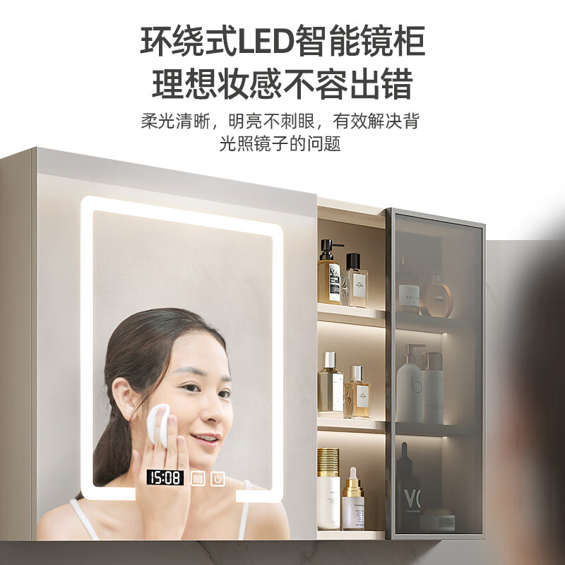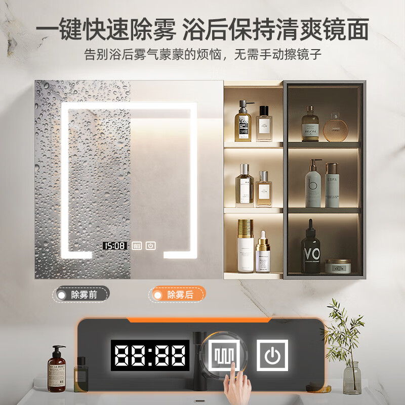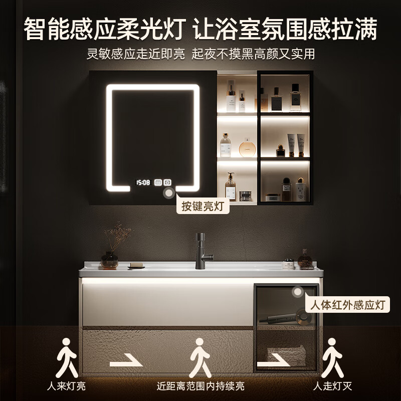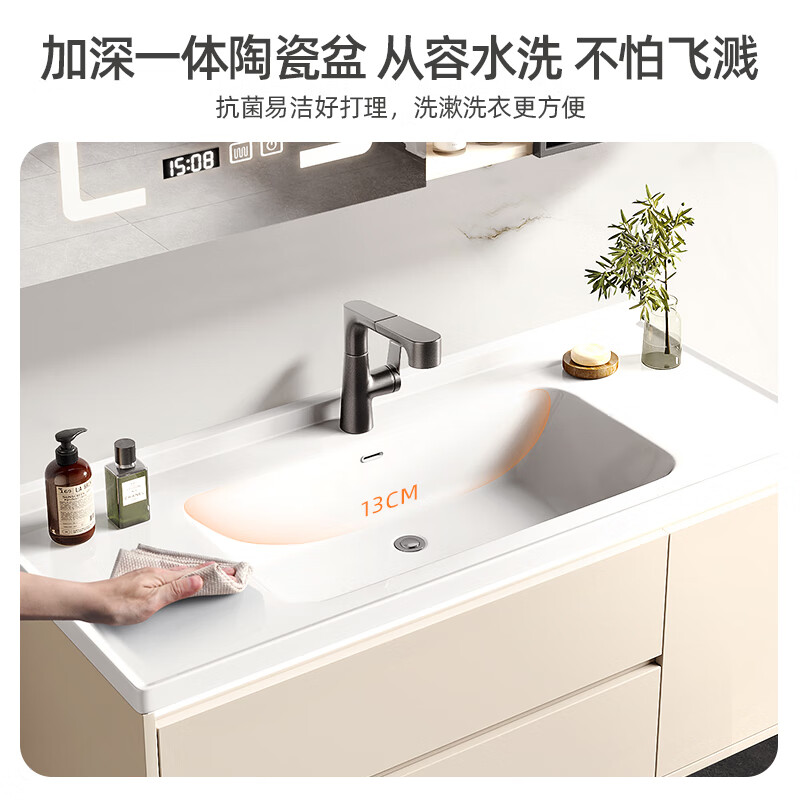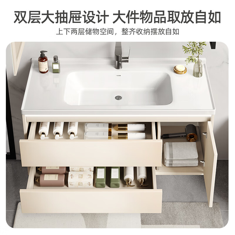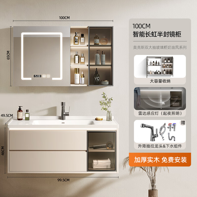 奥克斯奶油风浴室柜组合陶瓷一体盆 卫生间洗脸盆柜组合洗手盆洗漱台 100CM长虹智能镜柜款(带抽纸孔)