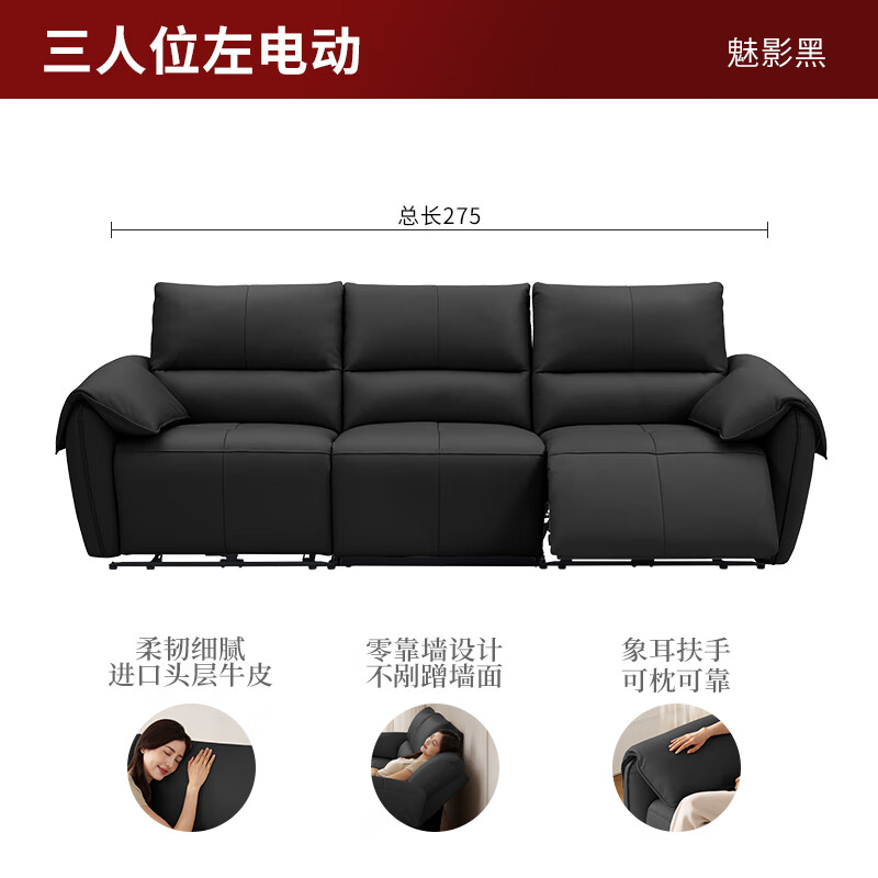 顾家家居真皮沙发 钢琴键 现代头层牛皮奶油风客厅大坐深羽毛填充沙发1259 【魅影黑】三人位左电动
