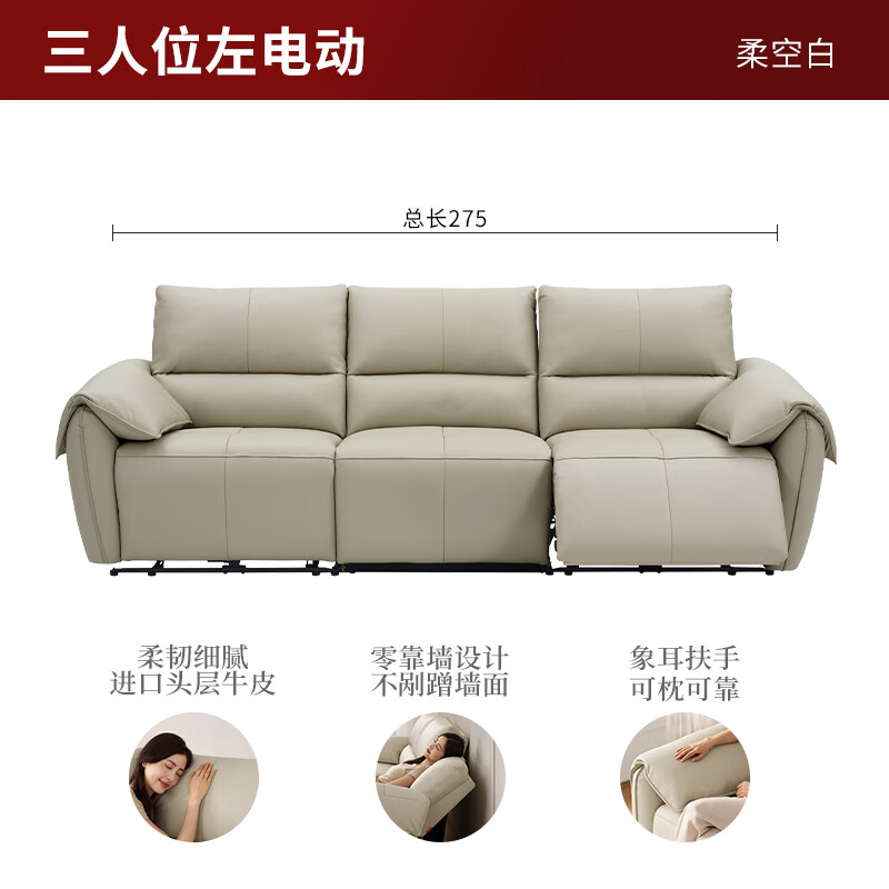 顾家家居真皮沙发 钢琴键 现代头层牛皮奶油风客厅大坐深羽毛填充沙发1259 【柔空白】三人位左电动