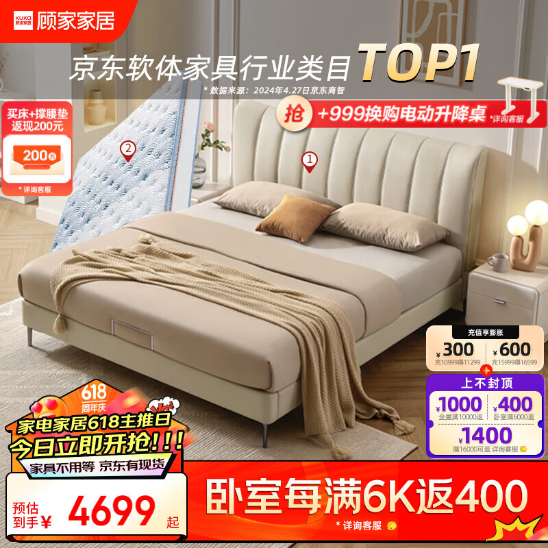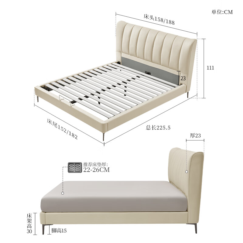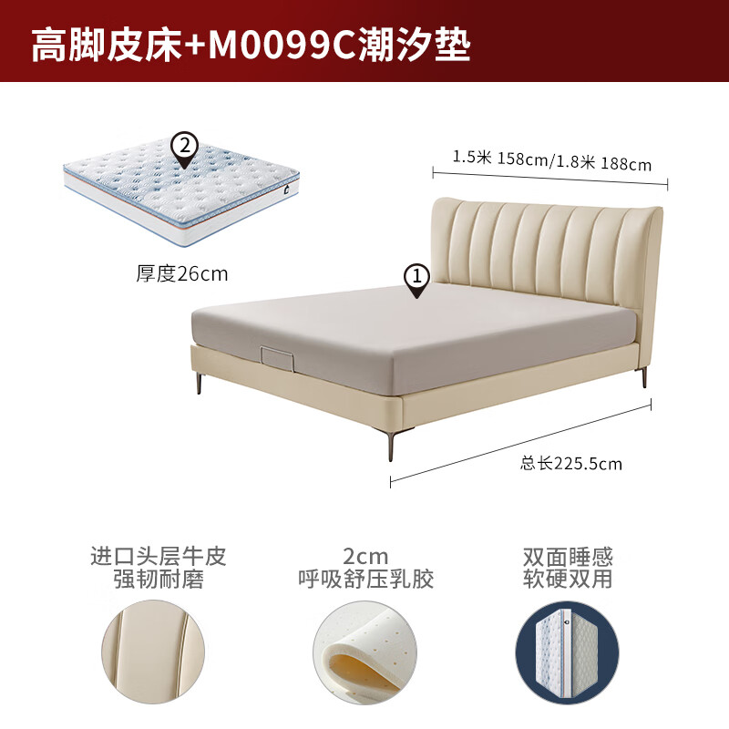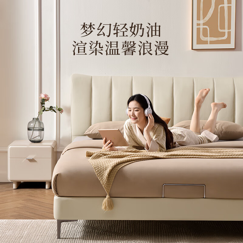 顾家家居奶油风头层牛皮床小户型贝壳床竖琴卧室双人床DS8153B 【月暮白】1.8米+M0099C潮汐垫