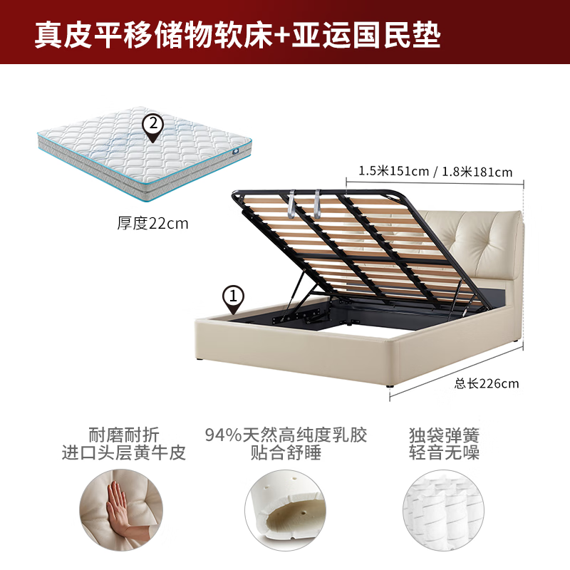顾家家居皮床 现代轻奢奶油风平移储物卧室双人大床进口头层牛皮婚床8173 月暮白1.8m+独袋弹簧乳胶垫