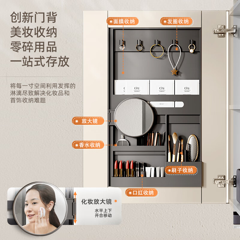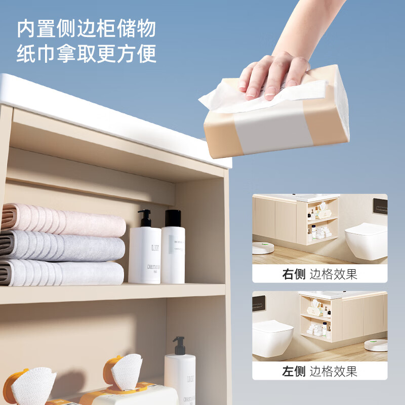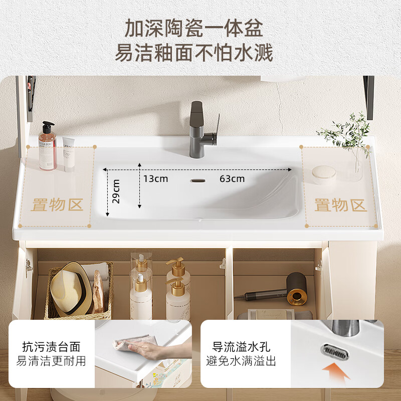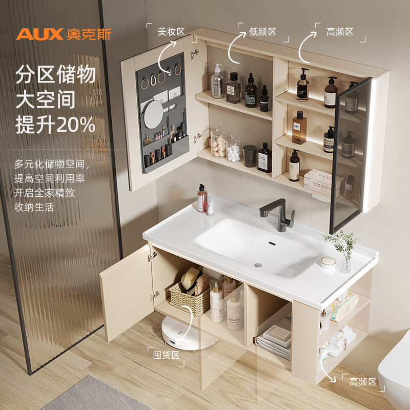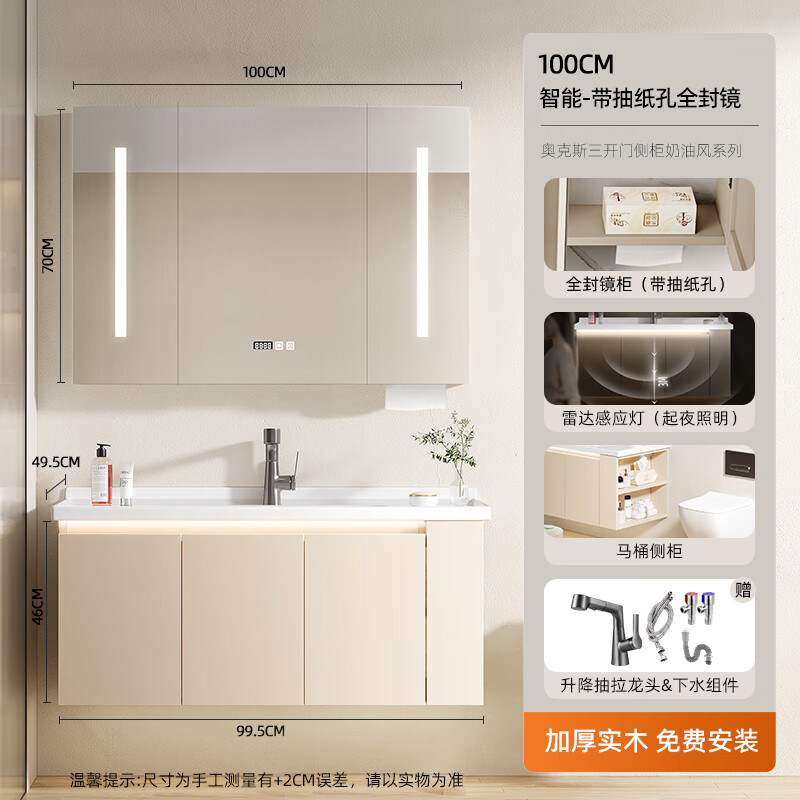 奥克斯奶油风卫生间洗脸盆柜组合浴室柜陶瓷一体盆 洗手盆柜组合洗漱台 100CM全封智能镜柜款(带抽纸孔)