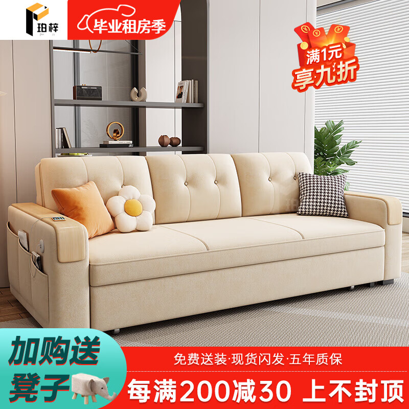 珀梓实木扶手沙发床两用可折叠小户型多功能猫爪绒单人双人折叠沙发床 基础款:高度海绵+亲肤牛奶绒 【外径2.3米+原木色实木扶手】