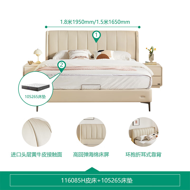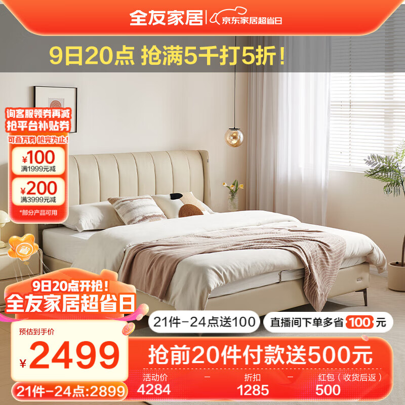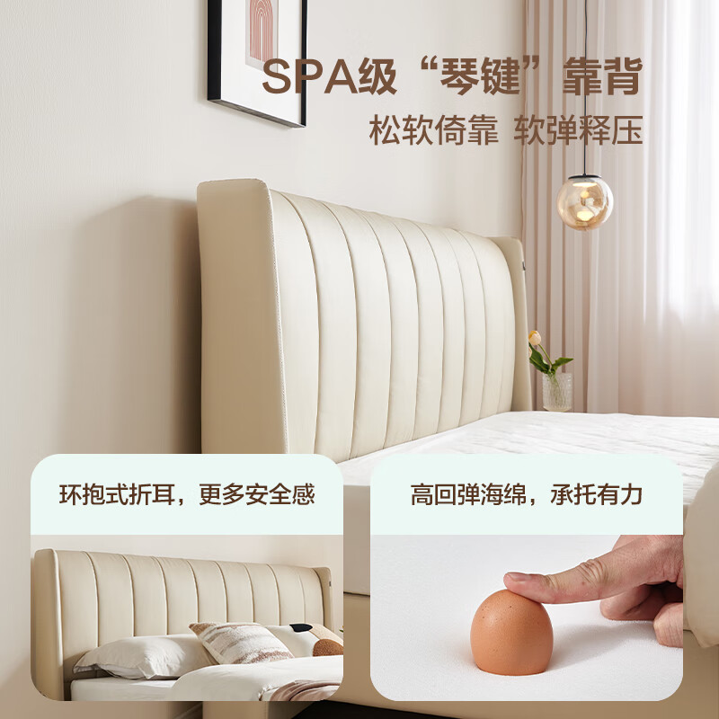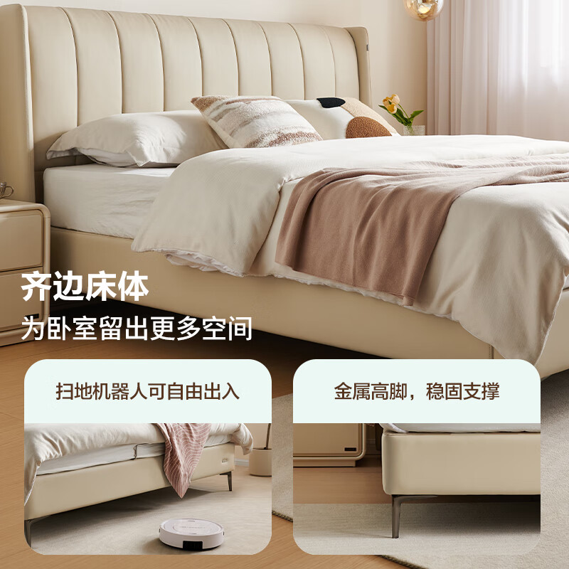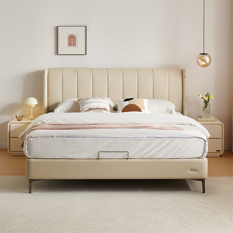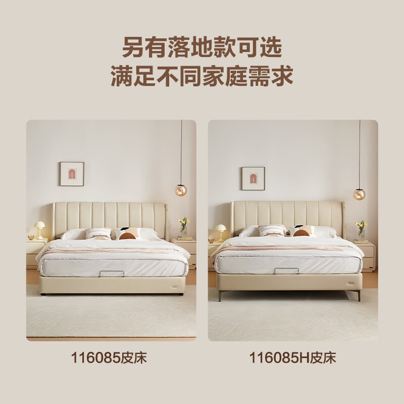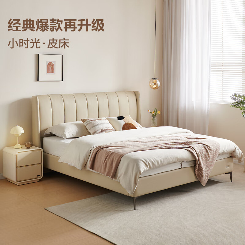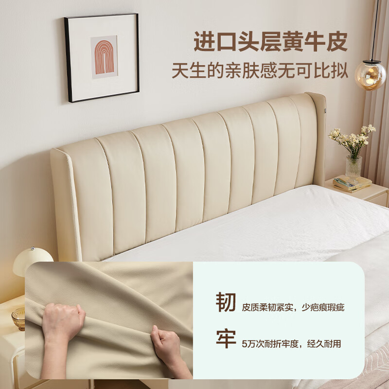 全友家居 头层牛皮真皮床主卧室奶油风1.8米软包床头高脚双人床116085