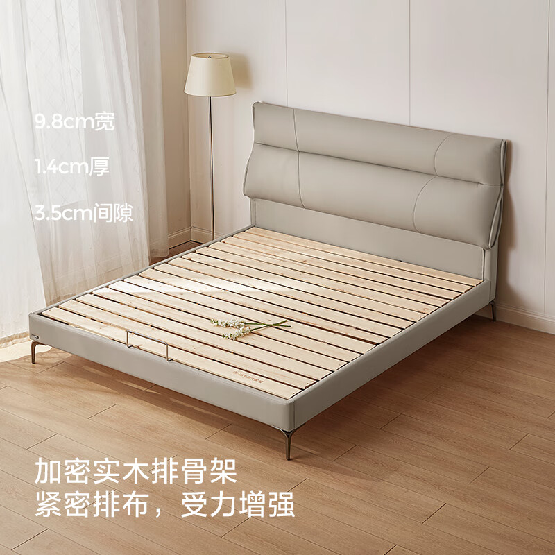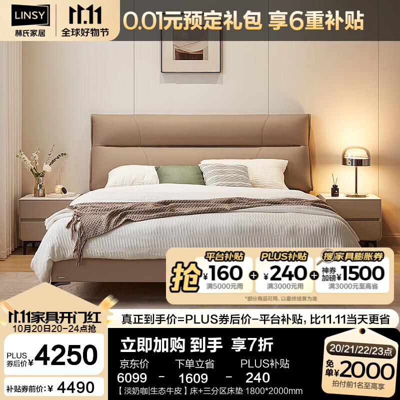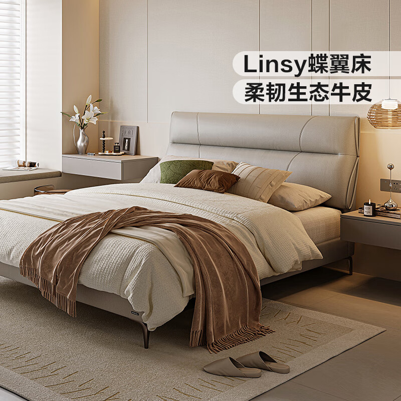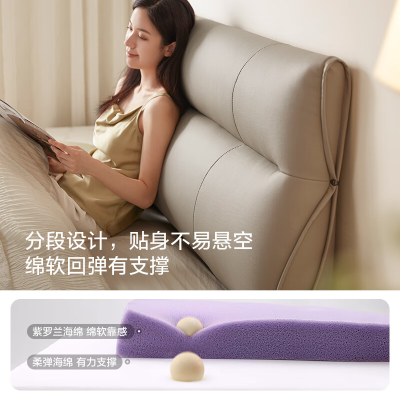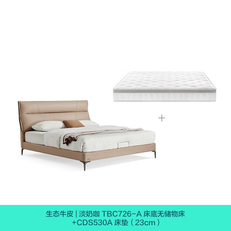 林氏家居互不打扰双人床简约大气布艺床生态牛皮林氏木业TBC726 【淡奶咖|生态牛皮】床+三分区床垫 1500*2000mm