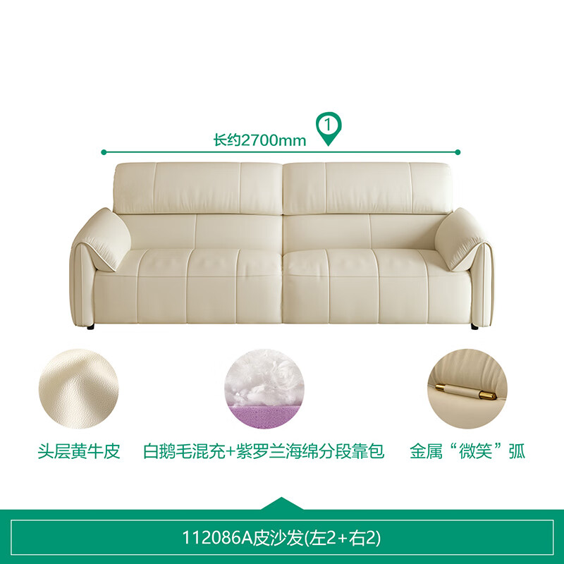 全友家居现代简约皮艺沙发客厅头层牛皮钢琴键三人位直排沙发112086 【奶油白|牛皮】2.7m沙发