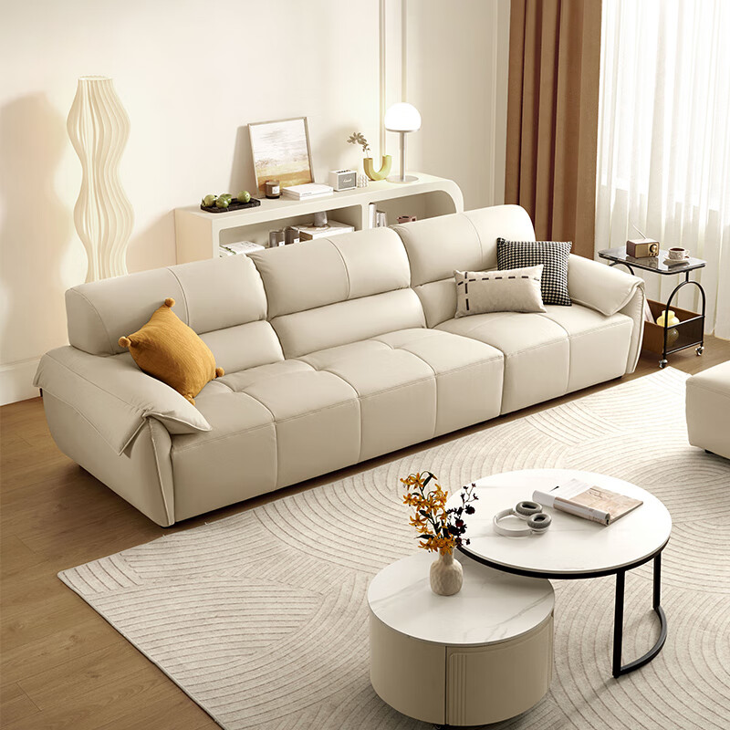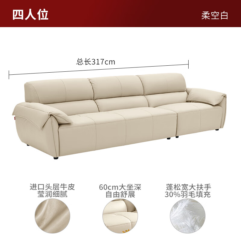 顾家家居真皮沙发 钢琴键 现代头层牛皮奶油风客厅大坐深羽毛填充沙发1259 【柔空白】 四人位