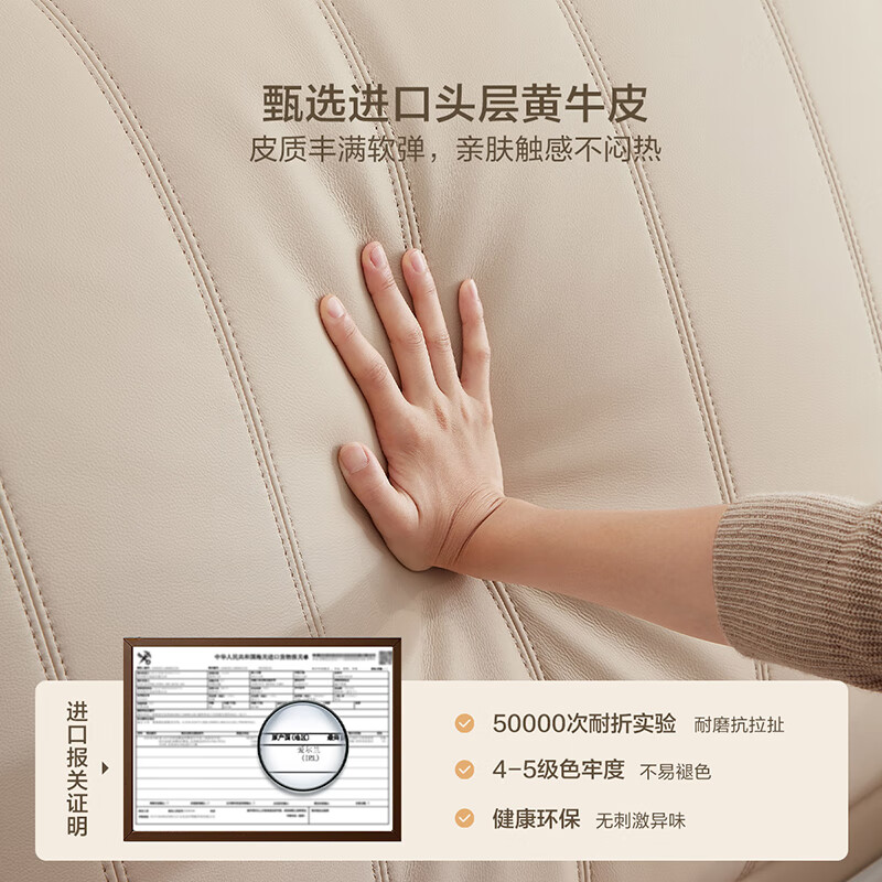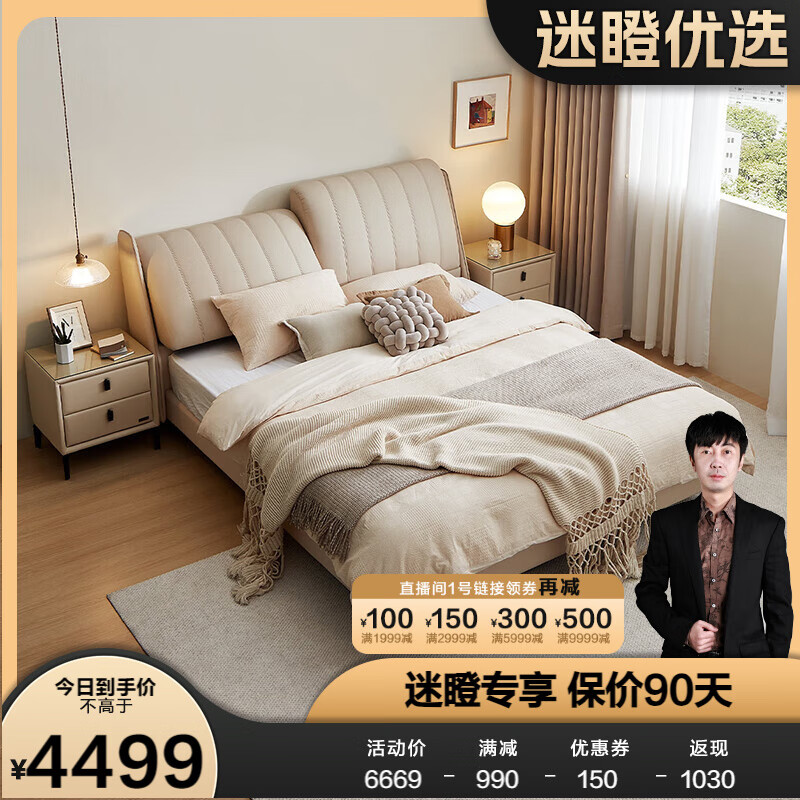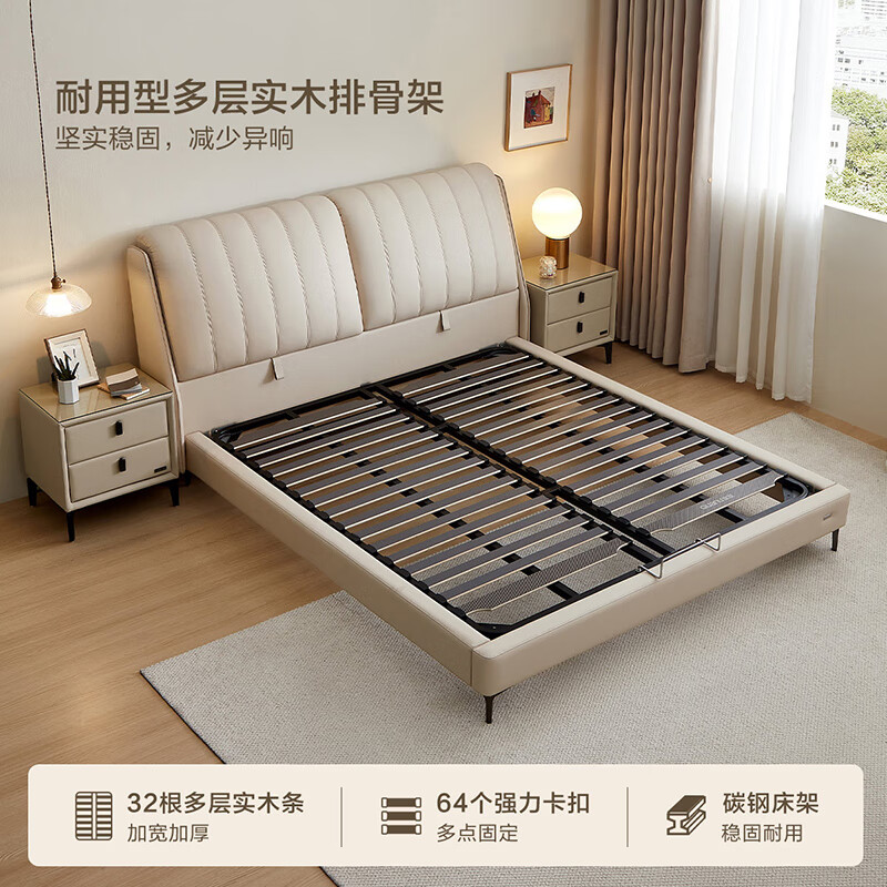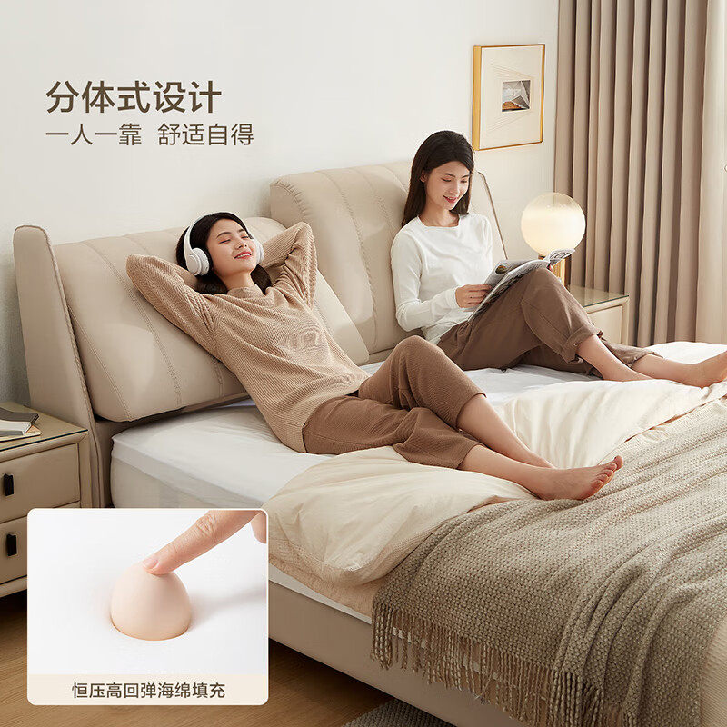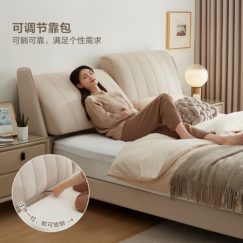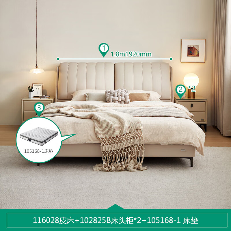 全友【迷瞪直播间】116028奶油风头层牛皮1.8米x2米多功能真皮软包床 倒岛1.8M功能皮床+床头柜*2+床垫 1800*2000