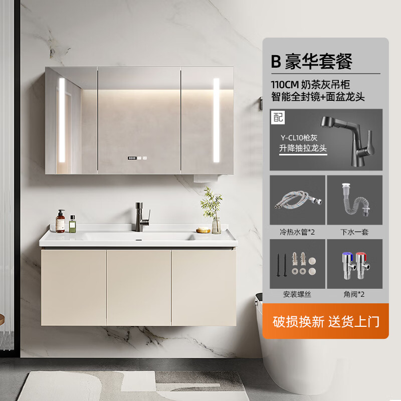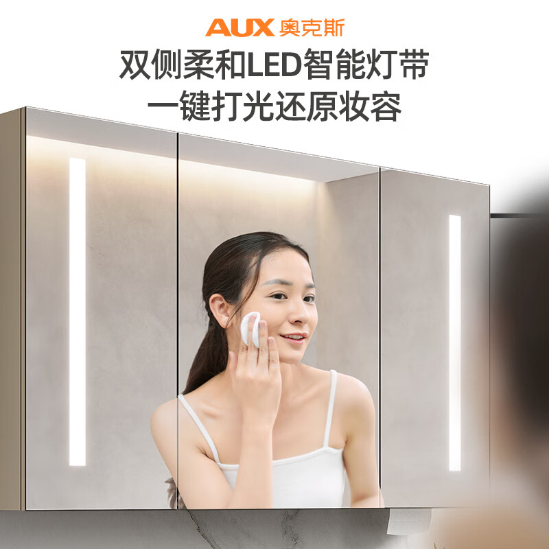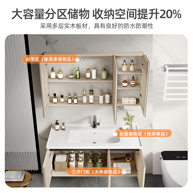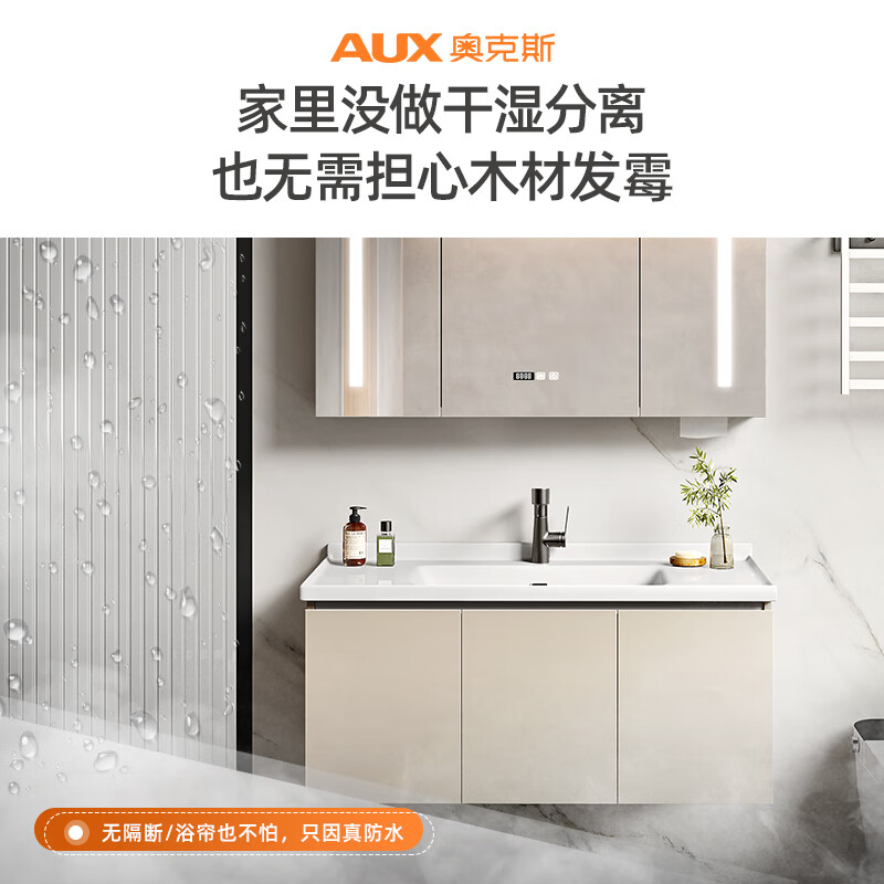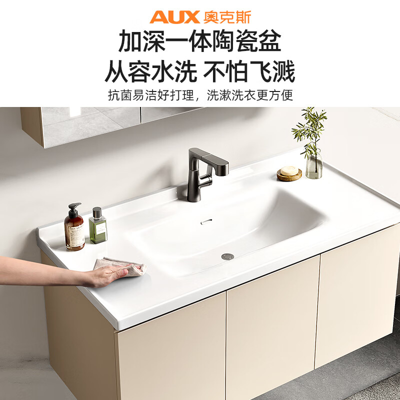 奥克斯奶油风浴室柜组合陶瓷一体盆 卫生间洗脸盆柜组合洗手盆柜洗漱台 110CM全封智能镜柜款(带抽纸孔)